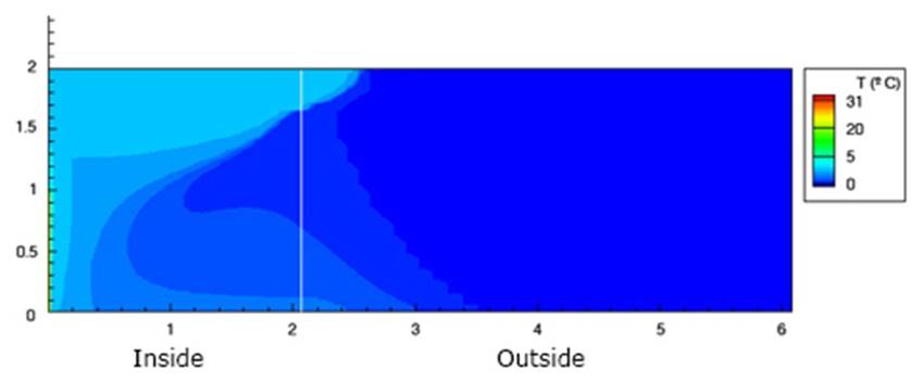 Η αεροκουρτίνα τοποθετείται στην κορυφή, με το φράγμα αέρα που δημιουργεί, διαιρεί τη ζεστή και την κρύα περιοχή σε δύο θερμικές ζώνες. Η αεροκουρτίνα διατηρεί το εσωτερικό περιβάλλον στην αριστερή πλευρά της εικόνας σε άνετη θερμή θερμοκρασία και αποφεύγει τη διείσδυση κρύου αέρα από το εξωτερικό. Σε αυτήν τη περίπτωση, εξοικονομεί έως και 80% της ενέργειας που δίνεται από τον θερμαντήρα που βρίσκεται στον αριστερό τοίχο.