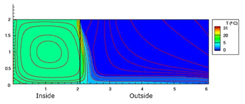 Η επιφάνεια του επόμενου διαγράμματος χωρίζεται σε δύο μέρη (στο x = 2): η αριστερή πλευρά που θεωρείται π εσωτερικός χώρος έχει θερμαντήρα στον τοίχο και η δεξιά πλευρά ο εξωτερικός χώρος που ψύχεται.