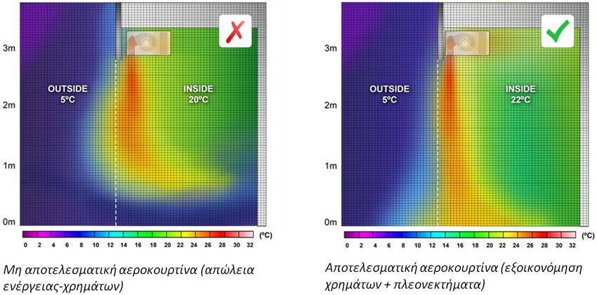 Σημαντική σημείωση: Οι κακώς σχεδιασμένες αεροκουρτίνες, οι λανθασμένες επιλεγμένες μονάδες (λιγότερο ισχυρές) ή η ανεπαρκής εγκατάσταση θα χάσουν μέρος ή ακόμη και όλα τα πλεονεκτήματα.